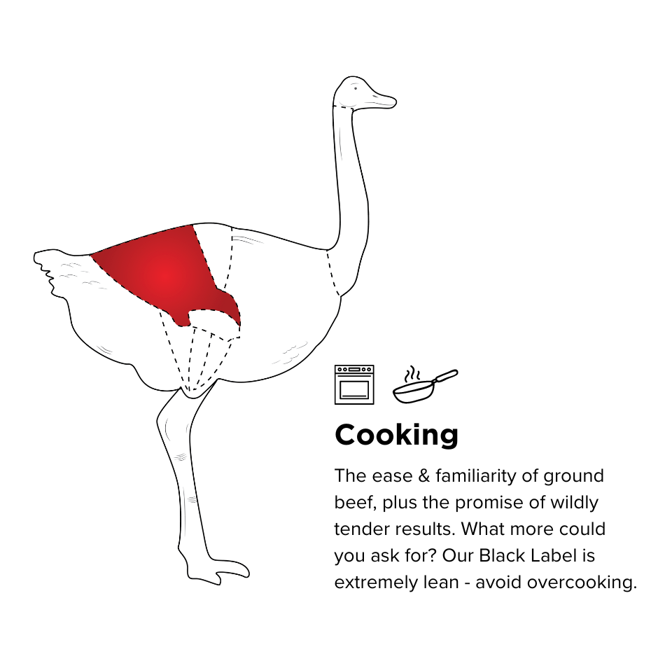 Black Label Ground tends to be juicier, more delicately textured, and more savory than our standard ground ostrich steak. Despite its indulgent taste, Black Label Ground Ostrich Meat is lean, low in fat, and high in protein. Healthy eating never tasted so good.