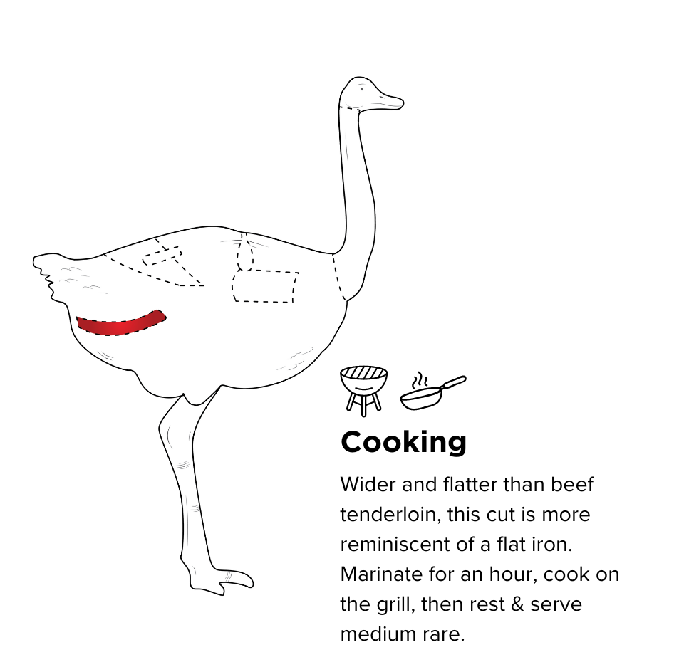 Ostrich tenderloin is a prized cut of lean red meat known for its premium flavor and remarkable tenderness. Unlike beef tenderloin, this cut is wider and flatter, resembling the shape of a flat iron. Each ostrich yields only two tenderloins, making this cut a rare and coveted delicacy.
